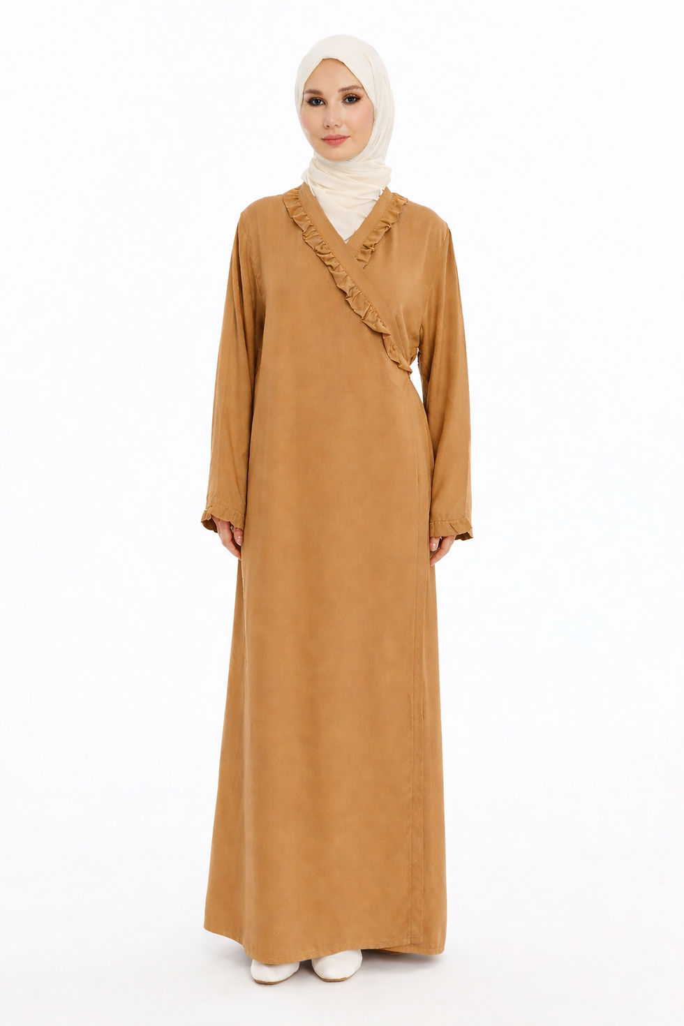 Camel Rengi Pamuklu Viskon Fırfır Detay Ev-Namaz Elbisesi